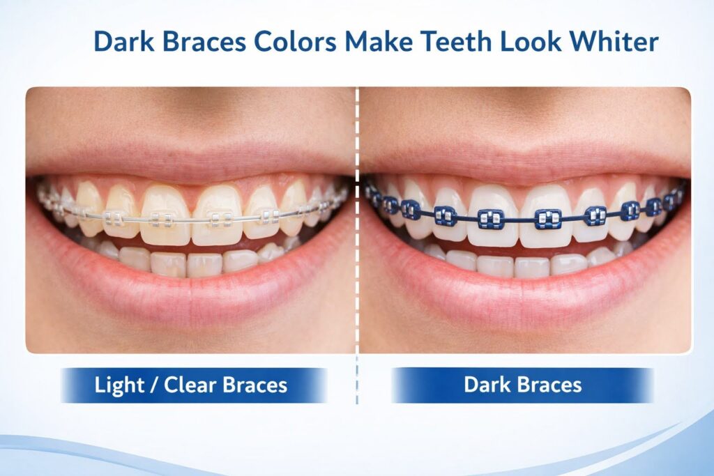 Many patients ask what color braces make teeth look whiter. The answer usually involves darker shades.